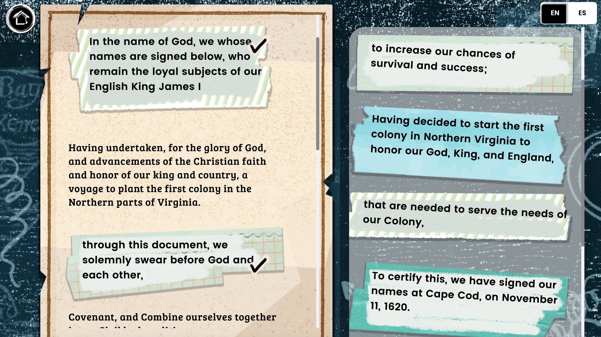 description: YATH: Investigating the Mayflower Compact takes middle-school students through the Who, What, Where, When, and Why of the Mayflower Compact’s creation in 1620. Players navigate the Mayflower across the Atlantic, translate the Compact into modern-day English, and learn about why the Compact’s core tenets are still relevant today. The game is playable on Plimoth Patuxet’s website.