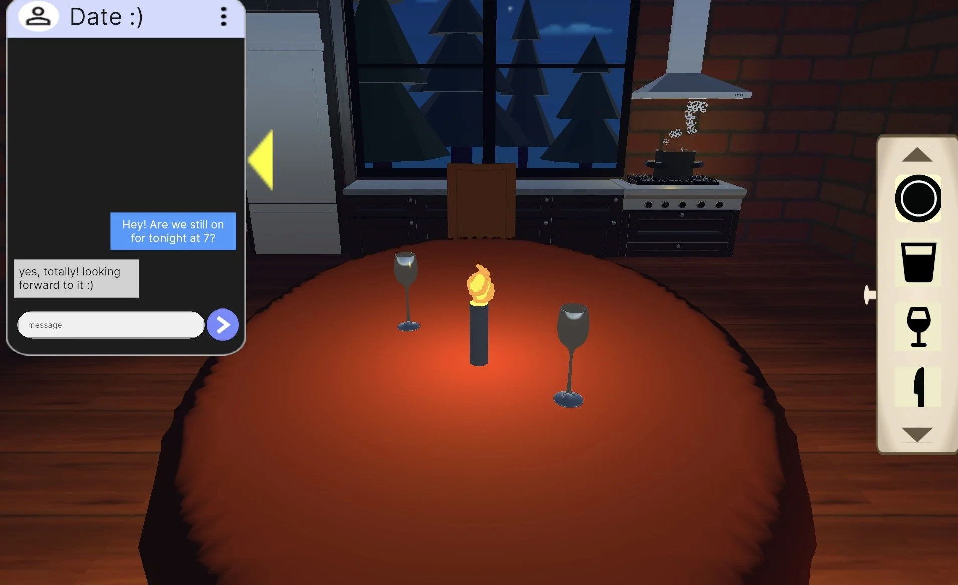 description: Table for Two is a first-date simulation prototype using MDA (Mechanics / Dynamics / Aesthetics) game design framework to convey emotion through mechanics. Our emotional prompt was “a solitary experience that you wished you could have shared with someone else,” which we explored by tasking a player to set a dinner table before a date. You can play it here on itch.io. We created it in a group project for Northeastern’s GSND5110: Game Design & Analysis.